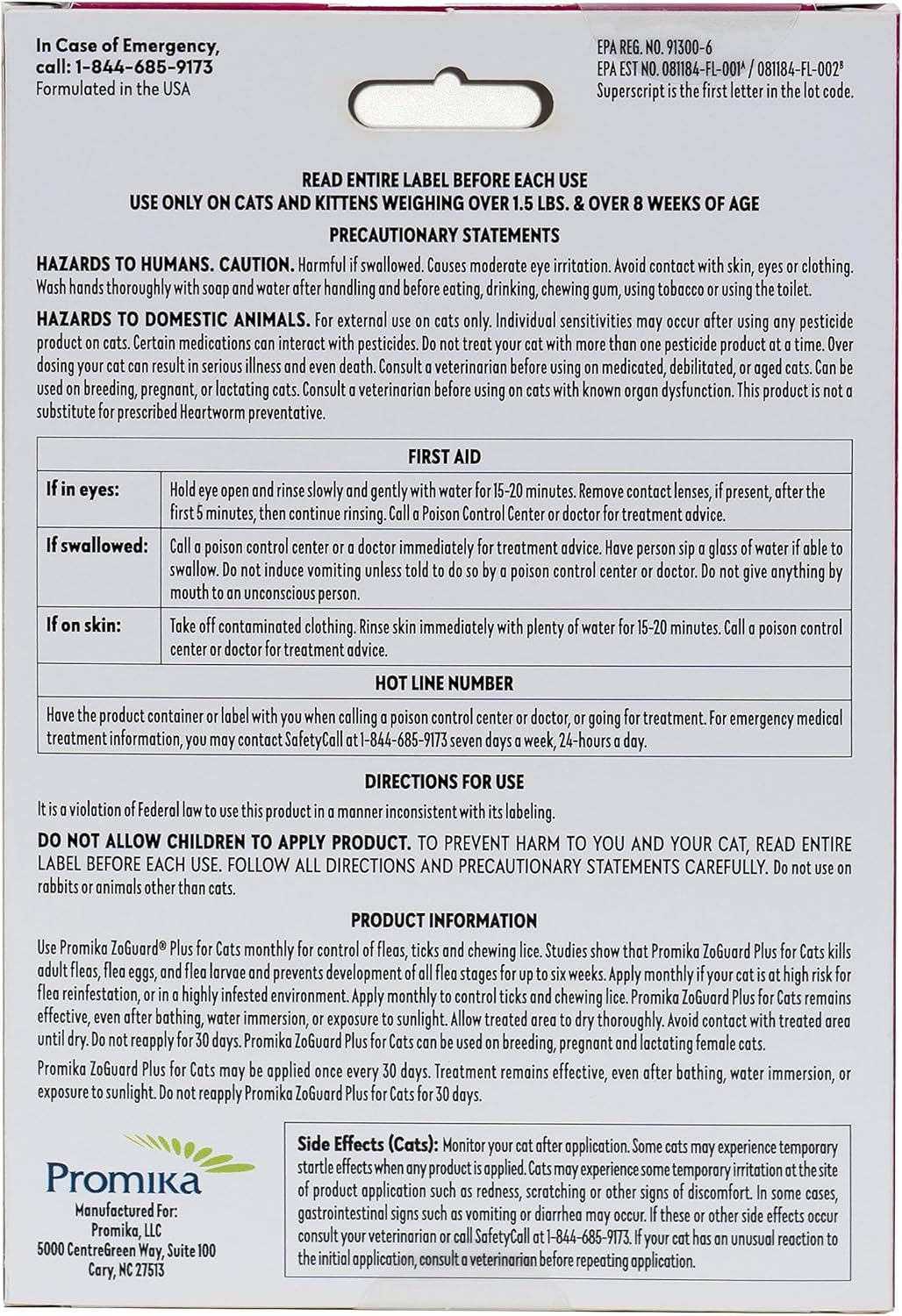 About this item SAME EFFECTIVENESS AS TOP COMPETITORS: You can get the same level of protection with our product, which contains the same amount of active ingredients as top competitors, but at a significantly lower cost. DESTROYS FLEAS AT ALL LIFE STAGES: Breaks the flea life cycle by killing all stages of fleas: Eggs, Larvae, and Adults. ELIMINATES TICKS AND LICE: ZoGuard Plus for Cats is effective against four species of ticks, including those that may transmit Lyme disease. This product can also swiftly eliminate chewing lice. WATERPROOF: ZoGuard Plus for Cats maintains its effectiveness even after being exposed to water, sunlight, or bathing due to its waterproof formulation. KITTY SAFE: We prioritize providing cats with a dependable and convenient solution for flea and tick prevention. To ensure the quality of our product, we manufacture ZoGuard Plus for Cats in the USA and have it registered with the EPA. TRIPLE PROTECTION: Our triple protection formula is great for effectively breaking the life cycle of fleas and ticks. This comprehensive approach can ensure your puppies are protected for up to a month. › See more product details