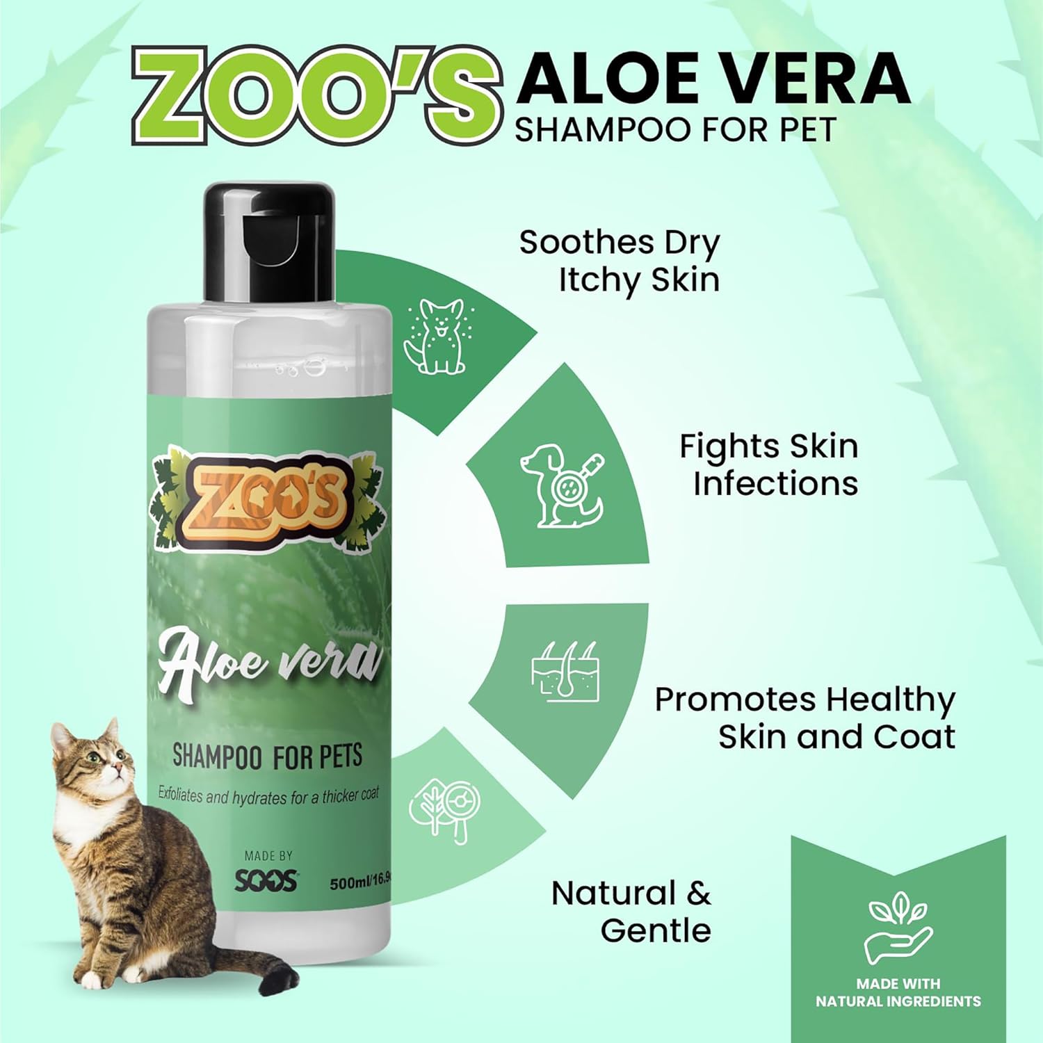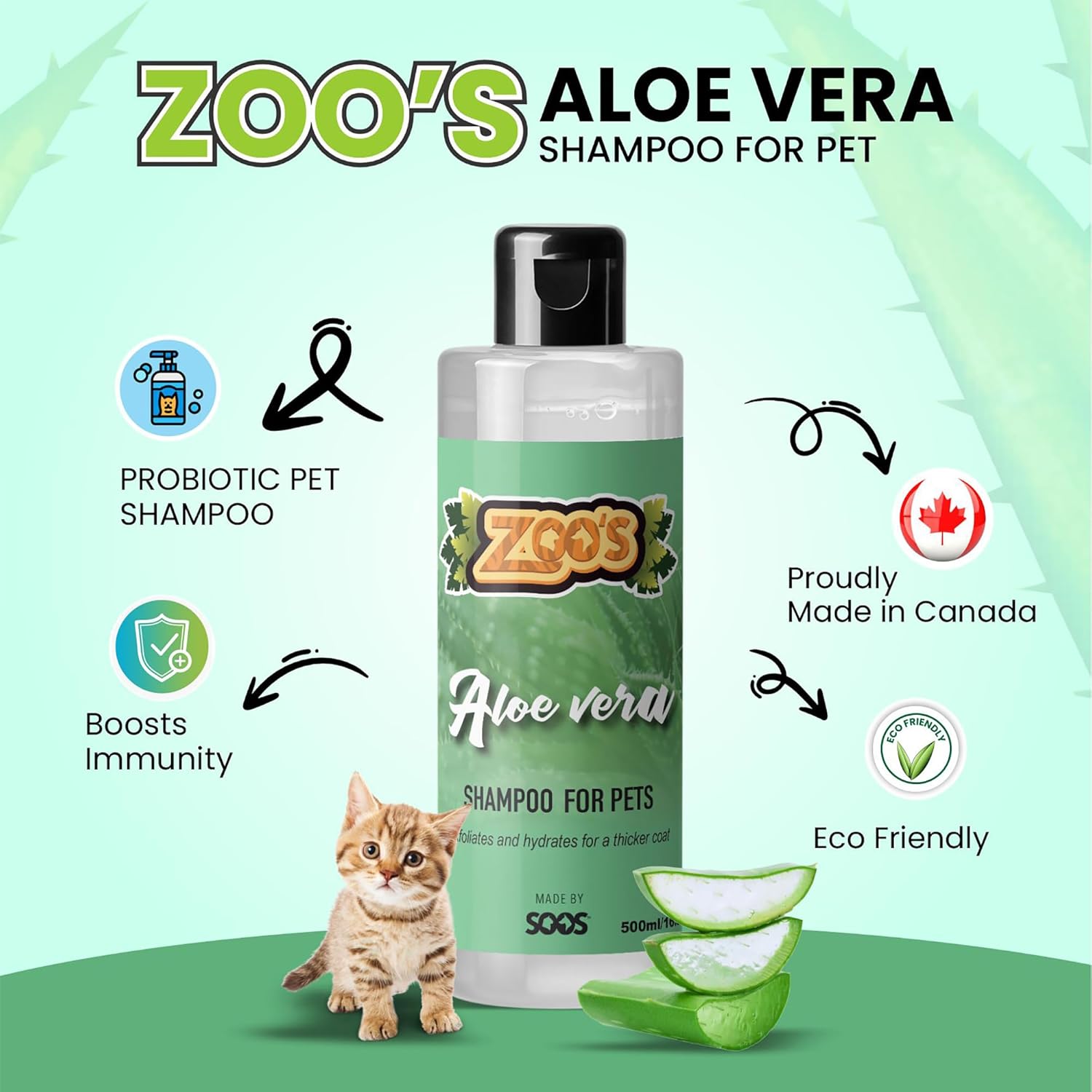 ZOO’S: Zoo's is our new Economy Line of pet shampoos made by Soos. Enjoy our gentle formulas that provide affordable solutions for stronger and softer coats, calm and moisturize skin, fresh scent and silky feel. WHAT’S MORE: We are providing you the best quality pet products for the wellbeing of your four-legged friends. We promise to source only the Good quality ingredients and products. PRODUCT PARAMETERS: Condition: 100% New Bottle Color: White Type: Aloe Vera Cat and Dog Shampoo Sizes: 500ml / 16.9 oz Package: 1x Aloe Vera Pet Shampoo BENEFITS: This dog and cat shampoo deto-xify, exfo-liate, promote healthy cell growth, improve circulation and aid chronic skin conditions with Natural Minerals. As our product with the highest concentration of minerals and ant-ioxidants. DIRECTIONS FOR USE: 1) READY TO USE, No need to dilute. 2) Using warm water, wet coat, and pour shampoo along pet’s back. 3) Gently work the shampoo into coat. 4) Add more if needed. Rinse and shampoo again. 5) Rinse until water is free of suds. Store at room temperature. Use only as directed.